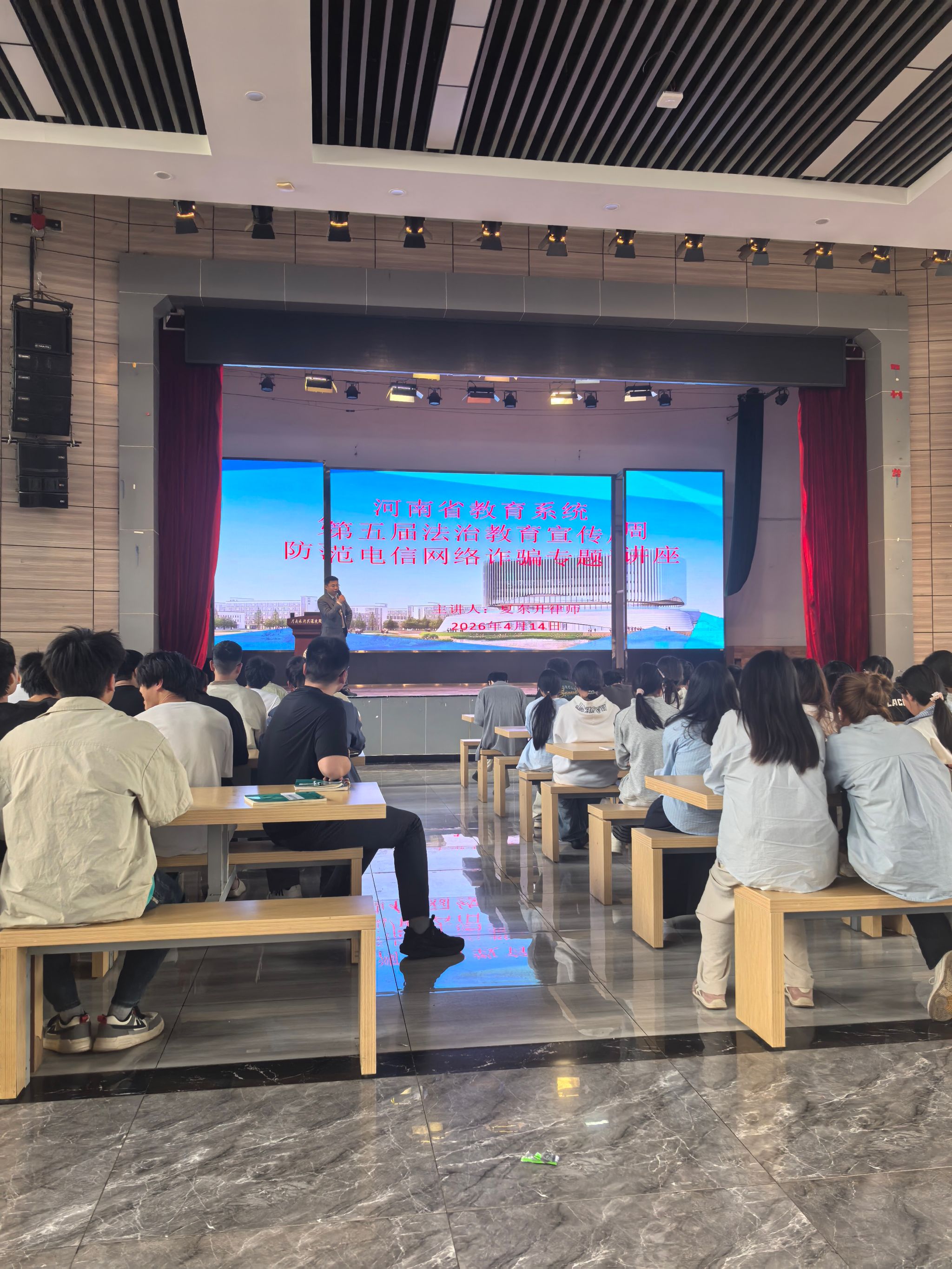 为深入学习贯彻习近平法治思想,全面落实河南省教育厅、河南省司法厅《关于开展全省教育系统第五届法治教育宣传周活动的通知》(教政法〔2026〕60 号)要求,切实加强青少年法治教育,增强师生法治观念,4月14日下午,我校联合信息工程学院、机电工程学院在花园路校区成功举办法治教育专题讲座。本次讲座特邀河南中砥律师事务所管委会委员、刑事法律部主任夏东升律师主讲,两个学院师生代表参加活动。